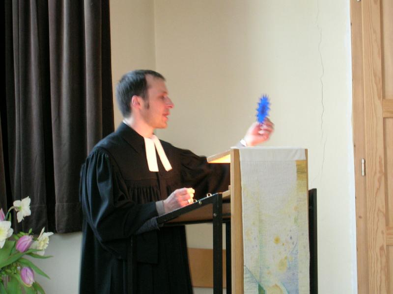 Pfarrer Eberhardt kam als Pfarrvikar nach Horb (Bildechingen), wurde kurz darauf zum zum Pfarrer zur Anstellung und bekam, als diese Zeit vorrüber war, die neu eingerichtete zweite Pfarrstelle in Horb. Nach vielen Jahren in Horb zog es ihn weiter und als er erfuhr, dass in seiner Heimatgemeinde die Pfarrei vakant sei, da bewarb er sich in die Heimat und wurde dort mit offenen Armen empfangen. Das erste Bild zeigt ihn mit seinem Koffer, der typisch für ihn ist. Ihn hat er in seiner Studentenzeit in Tübingen auf dem Sperrmüll aufgetan und trägt darin seit er Talare trägt seinen Talar darin zu den Gottesdiensten. Der erste Gottesdienst führte uns nach Norstetten in den Gottesdienstraum im Schloss. Im Anschluss gibt es dort immer Kirchenkaffee, den wir wie immer etwas hecktisch zu uns nehmen mussten, weil gleich im Anschluss der zweite Gottesdienst in Eutingen stat fand. Hanno und ich haben sehr viele Gottesdienste zusammen gestaltet, zumeist in Eutingen und -Nordstetten. Er als Pfarrer und ich immerhin als Organist ;-).